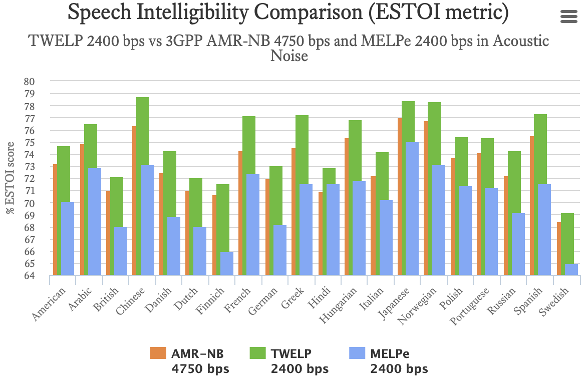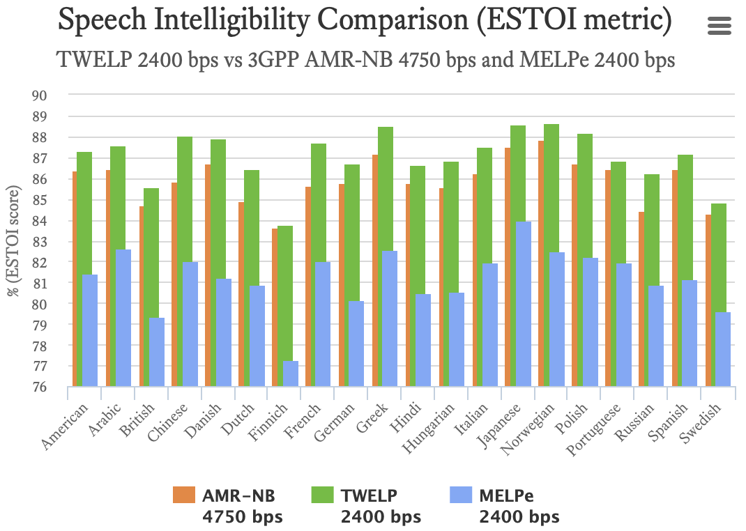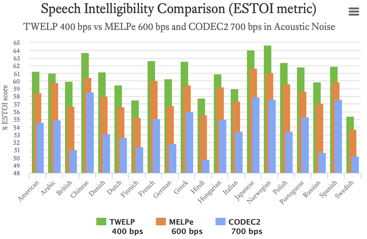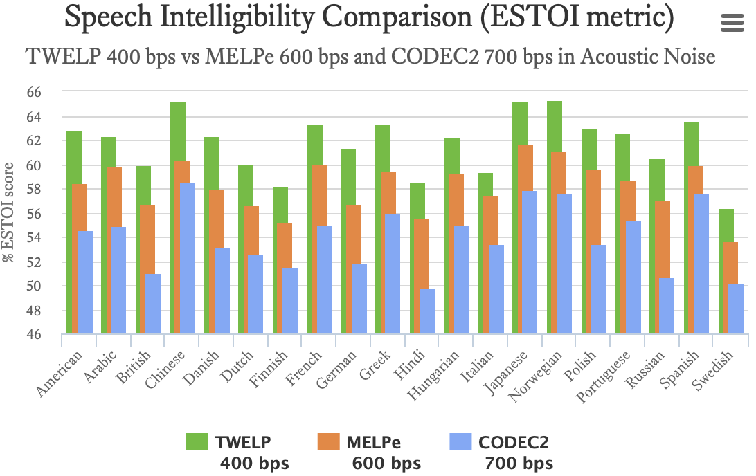 Previously, the TWELP 400 bps vocoder showed results comparable to the MELPe 600 bps vocoder, sometimes slightly surpassing or slightly lagging behind it depending on the language. According to the latest evaluations by DSP Innovations, TWELP 400 bps now demonstrates a small but measurable advantage in speech quality and intelligibility compared to MELPe 600 bps — especially in acoustic noise conditions — while operating at a lower bitrate
