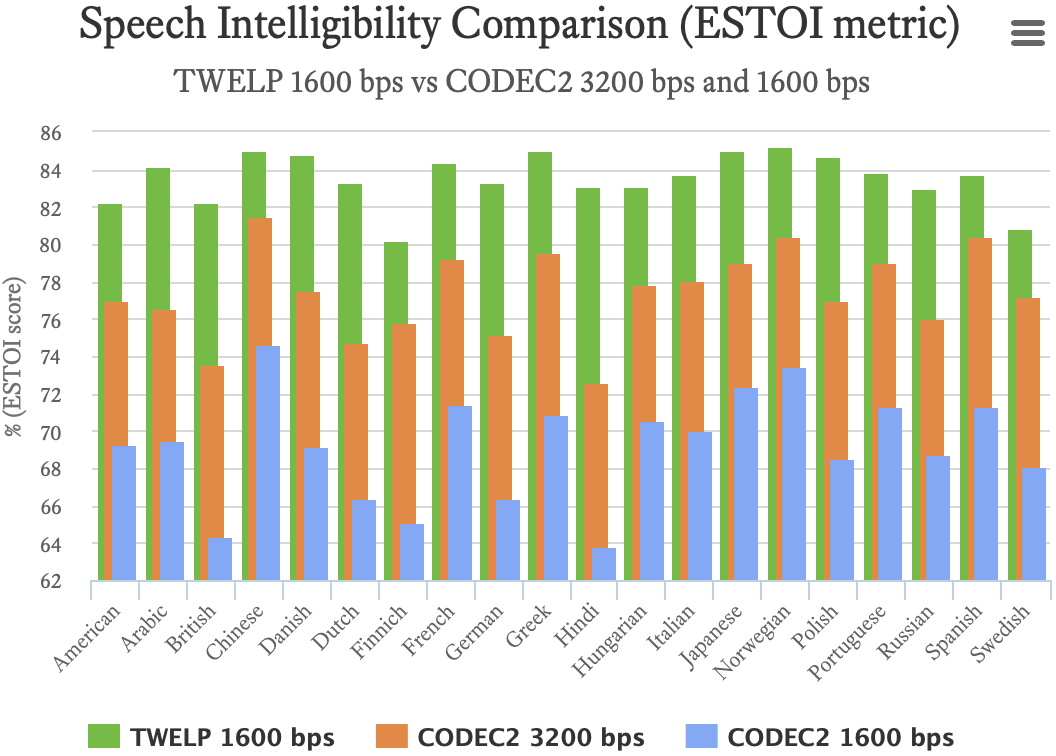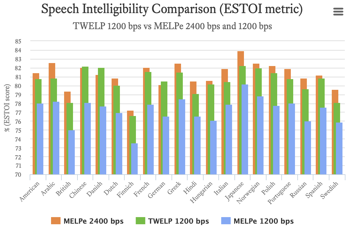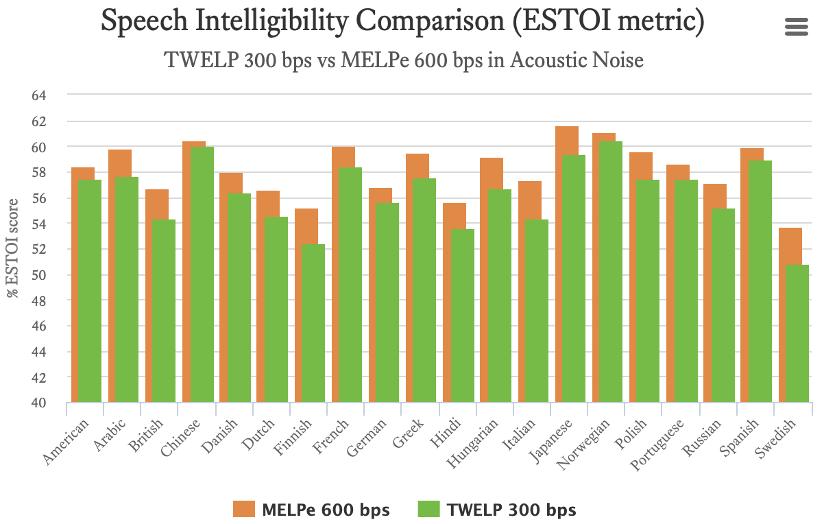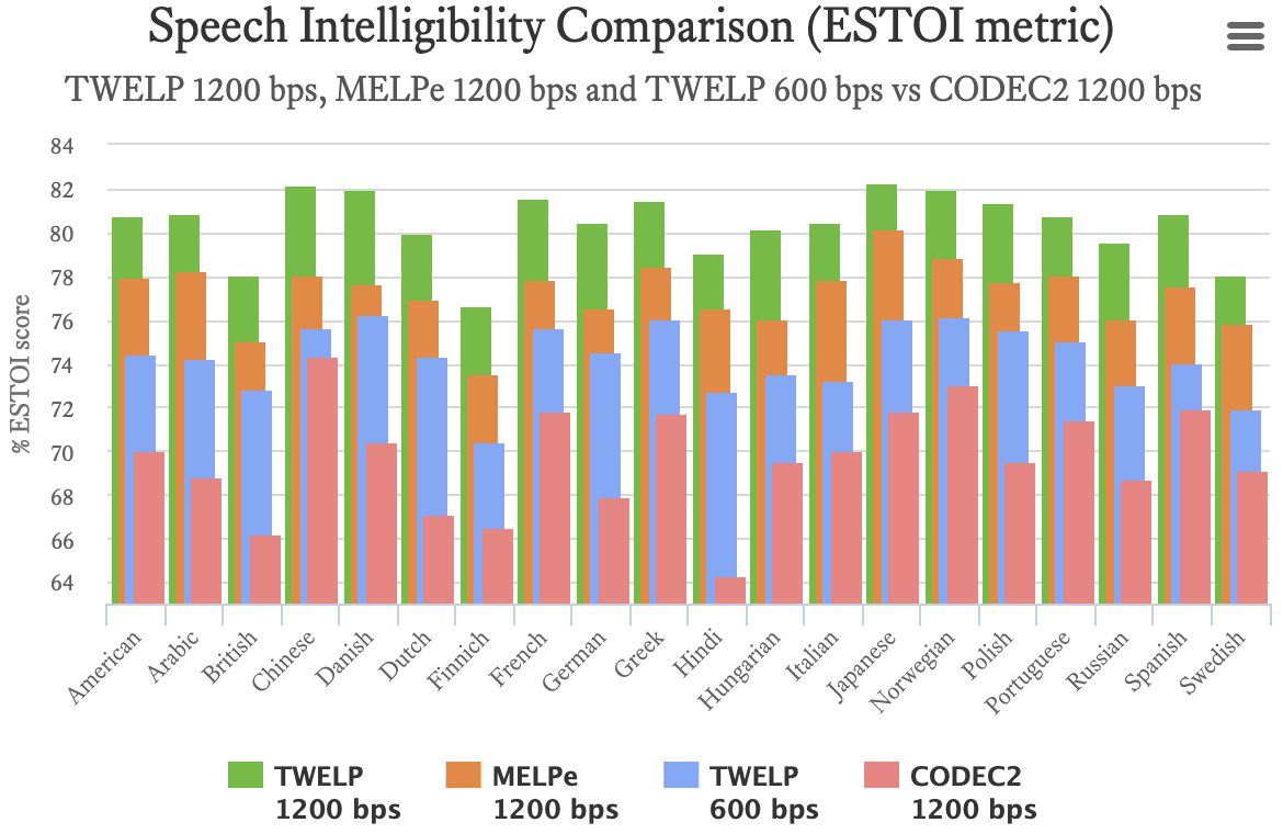 Previously, the TWELP 400 bps vocoder showed results comparable to the MELPe 600 bps vocoder, sometimes slightly surpassing or slightly lagging behind it depending on the language. According to the latest evaluations by DSP Innovations, TWELP 400 bps now demonstrates a small but measurable advantage in speech quality and intelligibility compared to MELPe 600 bps — especially in acoustic noise conditions — while operating at a lower bitrate
